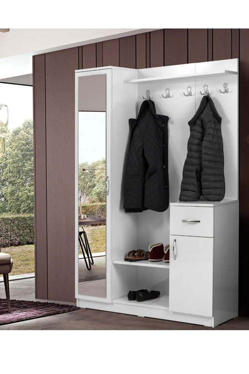 Flora Tek Kapılı Beyaz Aynalı Elbise Askılığı Kapaklı Vestiyer, Portmanto, Ayakkabılık