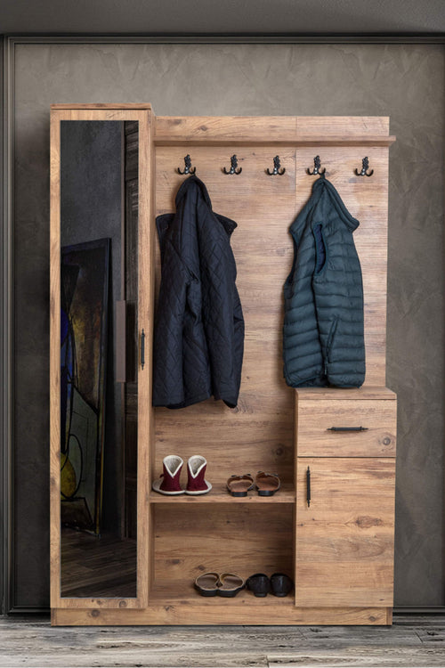 Flora Tek Kapılı Ceviz Aynalı Elbise Askılığı Kapaklı Vestiyer, Portmanto, Ayakkabılık